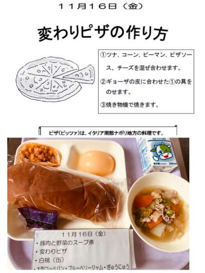 本日の給食は、豚肉と野菜のスープ煮、変わりピザ、白桃、大型コッペパン、ブルーベリージャム、牛乳です。