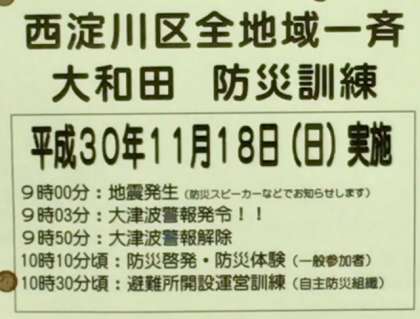 おはようございます。今日は午前9時より西淀川区一斉防災訓練が予定されています。淀中学校でも、大和田地区、大野百島地区の避難所開設訓練が予定されています。