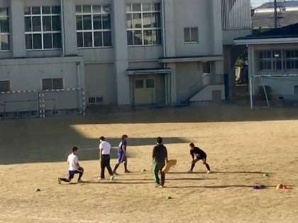 早朝のグラウンドでは、ラグビー部が練習していました。