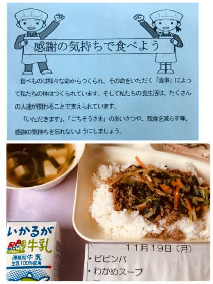 本日の給食は、ビビンバ、わかめのスープ、アーモンドフィッシュ、牛乳です。