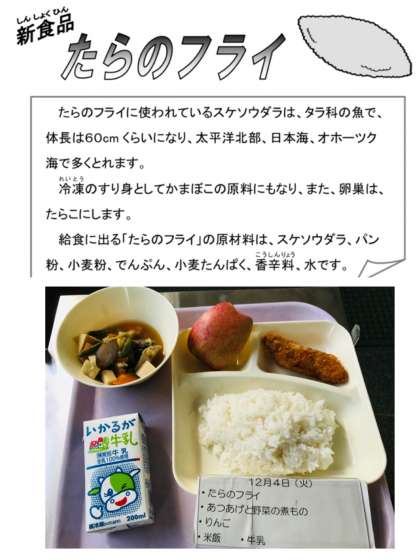 今日の給食メニューは、たらのフライ、あつあげと野菜の煮もの、りんご、米飯、牛乳です。