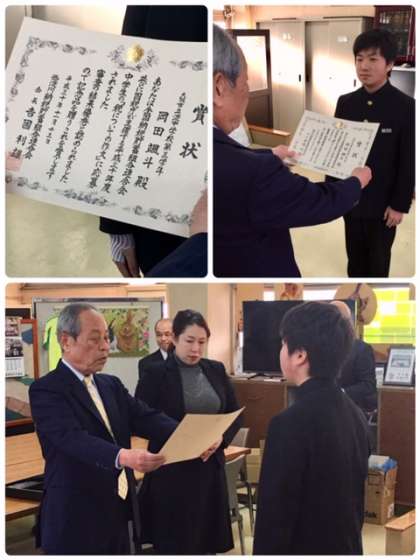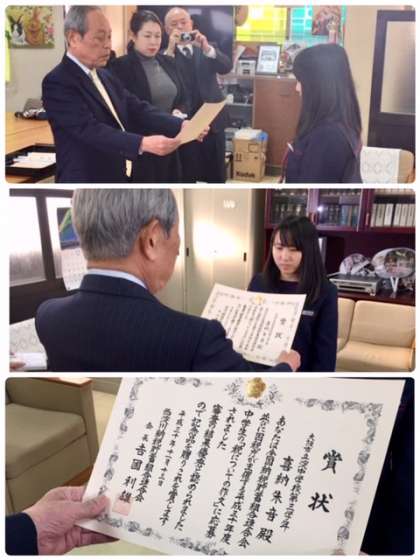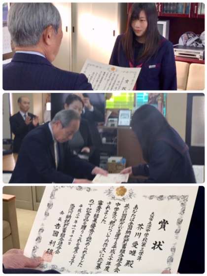 受賞したのは3年喜納朱音さん、芥川愛唯さん、岡田颯斗さんの3人です。