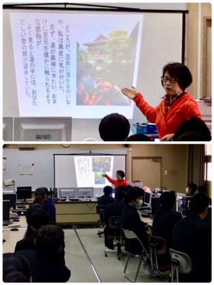 1時間目は、国語科中森先生の研究授業です。単元「漢詩の世界」第三次の授業です。今日はパソコン室で、起承転結を理解して物語を創作します。