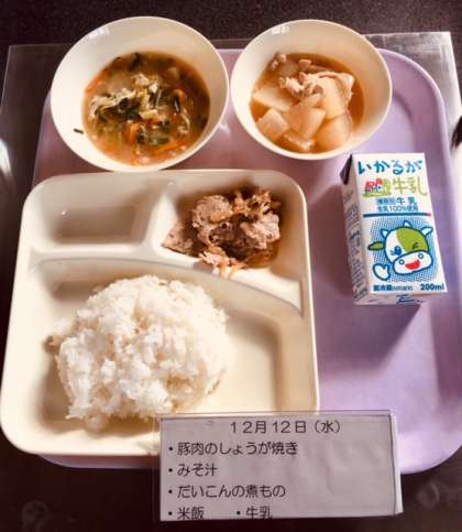 さて、本日の献立は、豚肉の生姜焼き、味噌汁、大根の煮物、米飯、牛乳です。