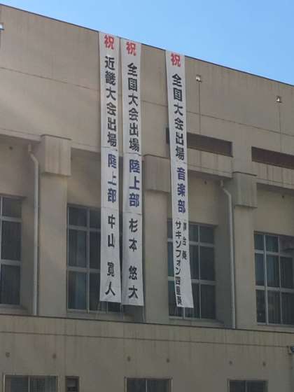 本日、午前に今年度活躍(近畿大会以上で出場)した生徒の懸垂幕が設置されました。