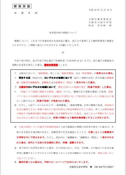 さて、12月10日に生徒を通じて「非常変災時の措置について」の文書を配付させていただきました。ご覧いただけましたでしょうか。保護者の方々からお手紙を見ていない、という声を聞きました。あらためてホームページ上でご確認ください。