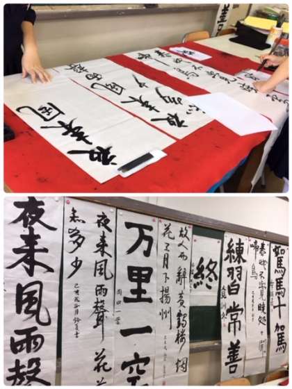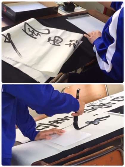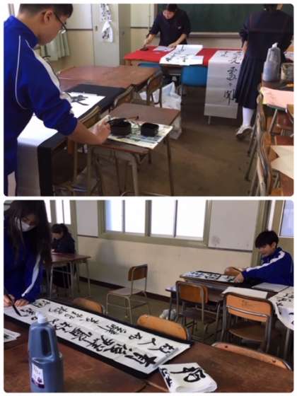 新年早々の書初めです。二学期に学習した漢詩を書いている人、自分の好きな字、今年の抱負を四字熟語で表現している人。色んな思いを作品にしました。