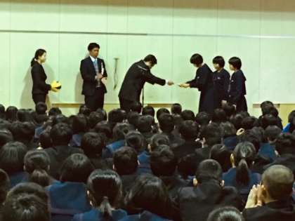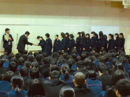 冬休み中の部活動でいただいた表彰状の伝達がありました。バレーボール部は大津カップで優勝しました。音楽部はMBSこども音楽コンクールで優良賞をいただきました。
