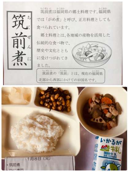 本日のメニューは、筑前煮、ひじき豆、だいこんのゆず風味、米飯、牛乳です。
