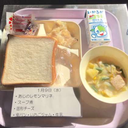 今日の献立は、アジのレモンマリネ、スープ煮、固形チーズ、食パン、いちごジャム、牛乳です。