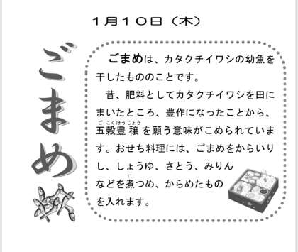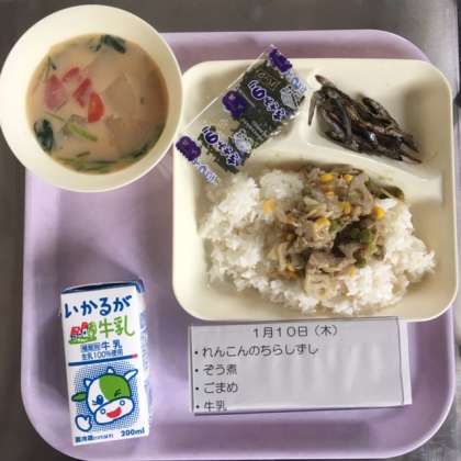 本日の献立は、お雑煮、レンコのチラシ寿司、ごまめ、牛乳でした。