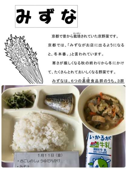 本日の給食は、さごしのしょうゆだれかけ、みずなの煮びたし、みそ汁、米飯、牛乳です。