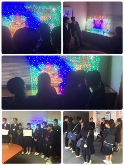 表彰式後に、区長応接室の電気が消され、作品を見せていただきましたが、立体的に作品が見えました。淀中学校では、新・旧生徒会の皆さんが力を合わせて作品づくりをしました。良い伝統となって、来年も良い作品を作ってくれることを期待しています。改めて全校集会で賞状の伝達を行います。