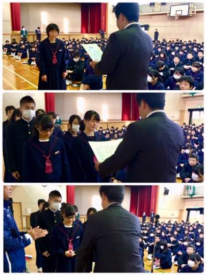 最初は、表彰状の伝達です。最初はバレーボール部です。バレー部は大阪バレーボールフェスティバルで優勝して表彰を受けました。次は生徒会です。生徒会は西淀川区イルミネーション作品コンテストで中学校の部第1位を受け表彰されました。生徒会長からは、応援してくれてありがとうございましたと挨拶がありました。