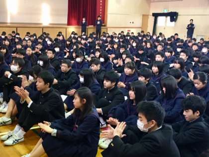 校長先生の話は「成人式」についてです。昨日は西淀川区でも新成人を祝って「成人の日のつどい」が西淀川区民センターで開催されました。昨年、6月の国会で「18歳成人法」が可決しました。実際の運用は2022年4月からとなり、現在の中学2年生・3年生が20歳を前に成人式を迎えます。成人といってもタバコやお酒は20歳まで認められませんが、結婚が親の承諾がなくてもできるなど、成人として大きな責任が生まれます。今から、大人になるための準備をする必要があります。
