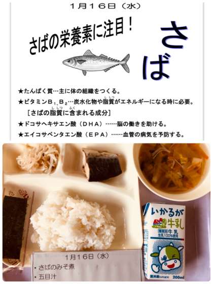 本日の給食は、さばのみそ煮、五目汁、もやしの甘酢あえ、米飯、牛乳です。