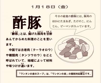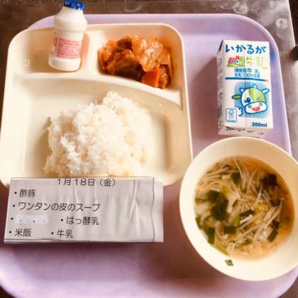 献立は、酢豚、ワンタンの皮のスープ、米飯、発酵乳、牛乳です。