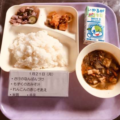 本日の献立は、サケの南蛮漬け、もずくの味噌汁、レンコンの赤紫蘇和、米飯、牛乳でした。