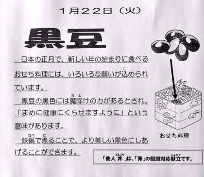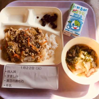 本日の献立は、他人丼、すまし汁、黒豆の煮物、牛乳です。