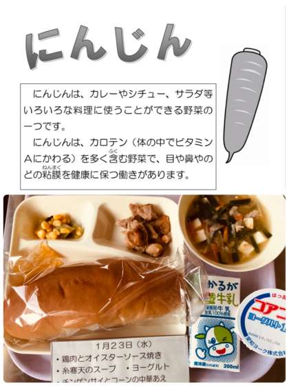 本日の給食は、鶏肉とオイスターソース焼き、糸寒天のスープ、チンゲンサイとコーンの中華あえ、ヨーグルト、大型コッペ、マーマレード、牛乳です。