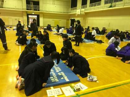 国語科の細見先生にお聞きしたところ、授業で一字決まり(読み札(上の句)の一字目が読手に読まれれば、どの取り札(下の句)を取るべきかが分かる)の勉強をしたそうです。