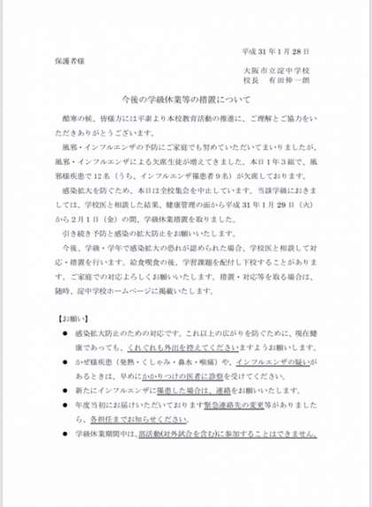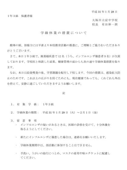 本日、インフルエンザ等かぜ様疾患生徒が増加しました。つきましては、学校医先生と相談のうえ、拡大防止のため1年3組で学級休業措置を取りました。
