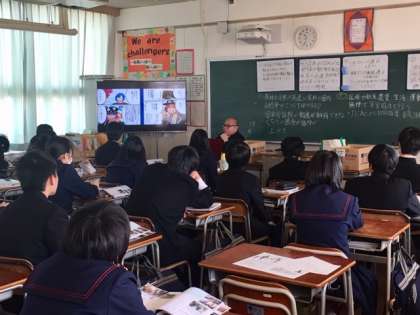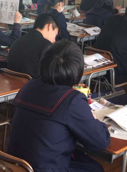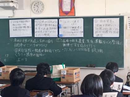 先週、3年生の教室に配備した大画面テレビを活用して授業しています。また、ホワイトボードで、生徒が意見や考えを共有して考えを深める授業です。