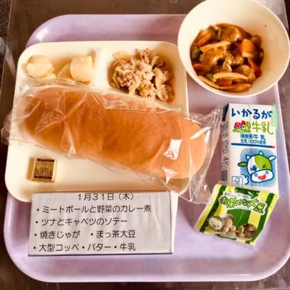 さて、今日の献立は、ミートボールと野菜のカレー煮、ツナとキャベツのソテー、焼じゃが、抹茶大豆、大型コッペパンとバター、牛乳です。