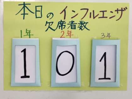 インフルエンザの流行については、雨がふり乾燥状態の緩和と、土・日曜日の休養のせいか、一定落ち着きを見せています。学級休業していた1年3組も本日より課業となりました。