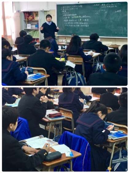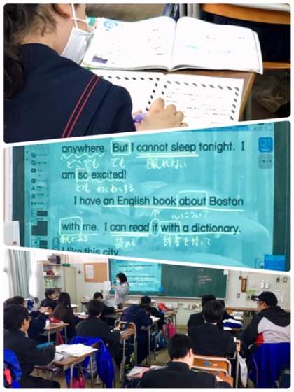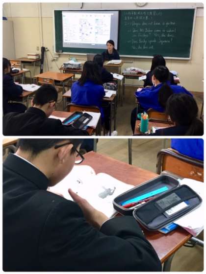 1年生の授業の様子です。英語の授業は1クラスを2つに分けて授業を受けています。1年生の教室は大画面テレビが設置されていないので、ICTを活用する時は、プロジェクタを使っています。デジタル教科書やパワーポイントでわかりやすいです。