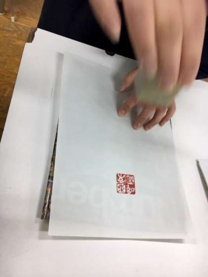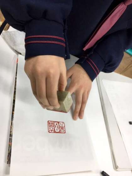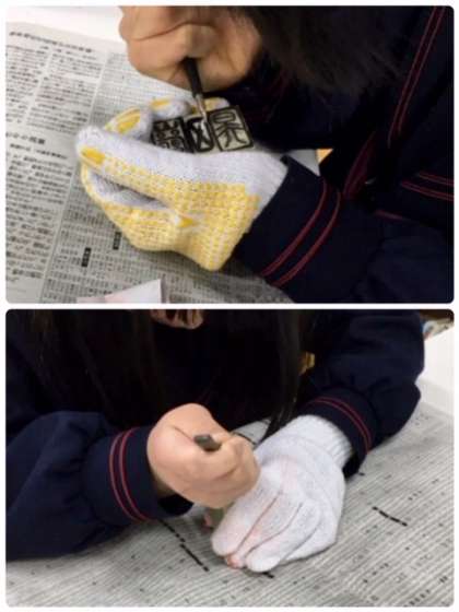 一年生のための篆刻教室です。初めて篆刻に取り組みます。印刀を恐る恐る握りしめて石と格闘しています。初めてにしたら上出来です。おしゃれな作品が完成しました。