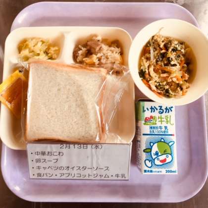 さて、今日の献立は、中華おこわ、たまごスープ、キャベツのオイスターソース、食パン、アプリコットジャム、牛乳です。