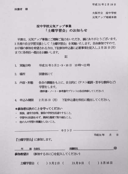 淀中学校元気アップ地域本部、今年度最終(3月)土曜学習会のご案内をします。学期末・進級を控え学年でやり残したことをやり切りましょう。本日、ご案内文書を生徒を通じて配付いたします。詳しくは青色文字をクリックしてください。ご確認いただけます。
