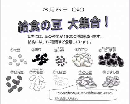 学校給食では、いろいろ種類のお豆さんが登場します。今日はとら豆です。