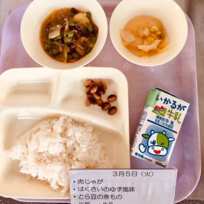 今日の献立は、肉じゃが、白菜の柚子風味、虎豆の煮物、米飯、牛乳です。