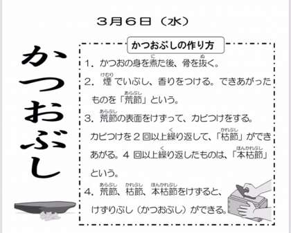 小松菜のおひたしに1人1パックずつ、鰹節(削りぶし)を添えていただきました。