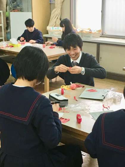 先生の指導で真っ赤なタコのおもちゃができました。学年主任の鹿島先生も一緒につくりました。