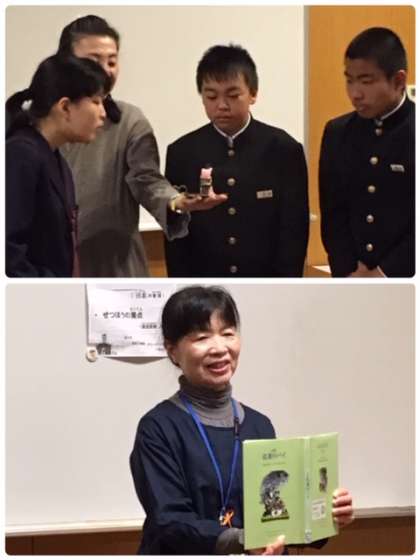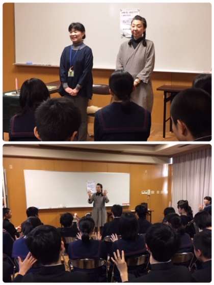 最終クラスは、2年3組です。いらして下さったパタポンさんは北山さんと浅井さんです。北山さんは毎週、図書室に来てくださっているので顔なじみの人もいますね。