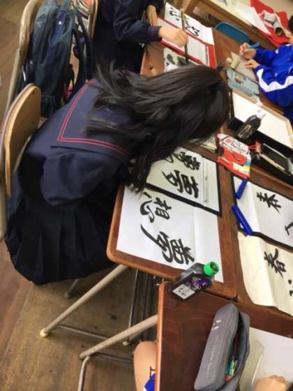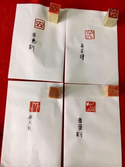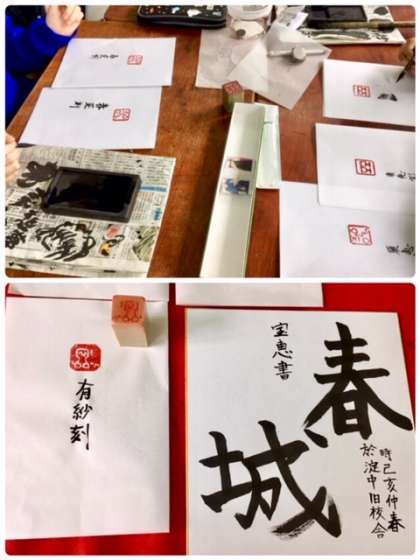 今日のドリームの活動は、篆刻と書の小さな作品を創作しました。書は色紙に季節感のある言葉を書きました。