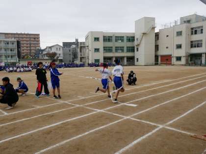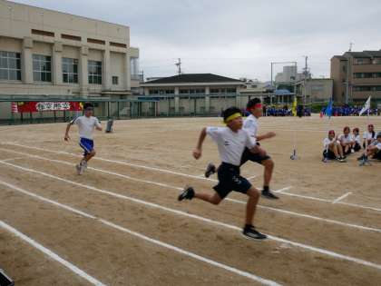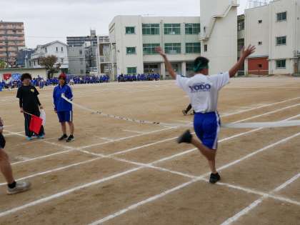 続いての個人競技は全学年男女の100m走です。50m走は直線でしたが100m走にはコーナーワークが必要です。しっかりと地面をとらえて走り抜けよう。