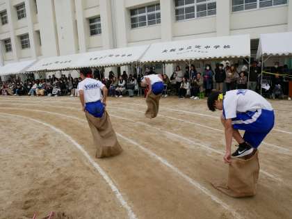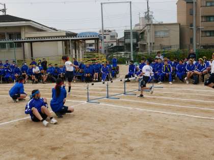 次の個人競技は障害物競争です。ハードルをまたぎ、ハシゴをくぐり、ドンゴロスをはいてジャンプ。お楽しみ競技みたいだけど、実はなかなかハードな競技です。昨年はこれにタイヤ押しがありましたがあまりに大変なので今年はなくなりました。みんな頑張れ。