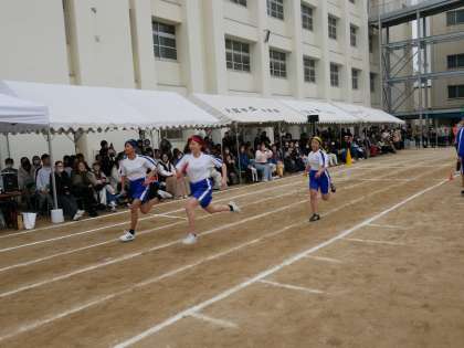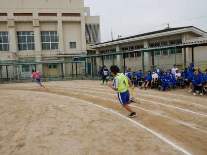 リレー種目の2つ目は全学年男女による男女混合リレーです。男子も女子も半周ずつ走ってバトンをつなぎます。これも力走また力走。勝負を決めるポイントはやはりバトンパスです。思い切ってスタートしよう。十分なリードをとろう。