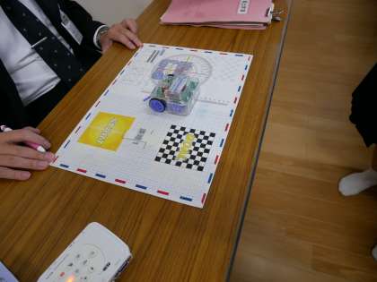 タブレット端末でプログラムをつくりロボットカーを動かす実習です。課題1から課題7まで設定されていて、進んでいる子は課題6まで挑戦して成功させていました。
