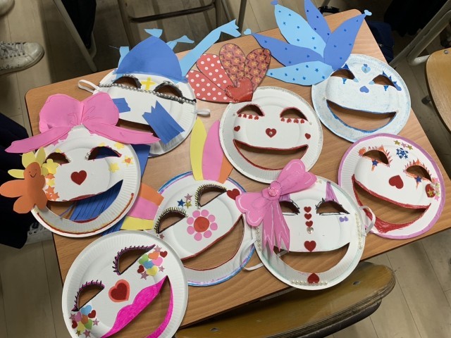 最後に周りの人を笑顔にするオリジナルの仮面も作成しました。日本語教室に飾ります!