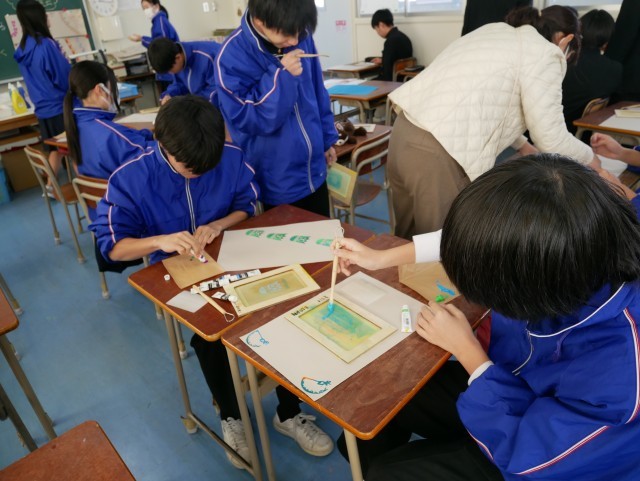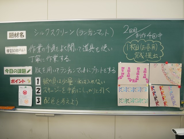 今日も授業のようすを見に行かせてもらいました。2年生の美術です。それぞれがデザインを考えてシルクスクリーンに描画し、色彩を考えて色をのせ、力を込めて刷り上げていきます。先生の説明をちゃんときき、前の黒板に示されたねらいやポイントをよく意識して作業に集中できていました。感心するような素敵な作品がたくさんありました。
