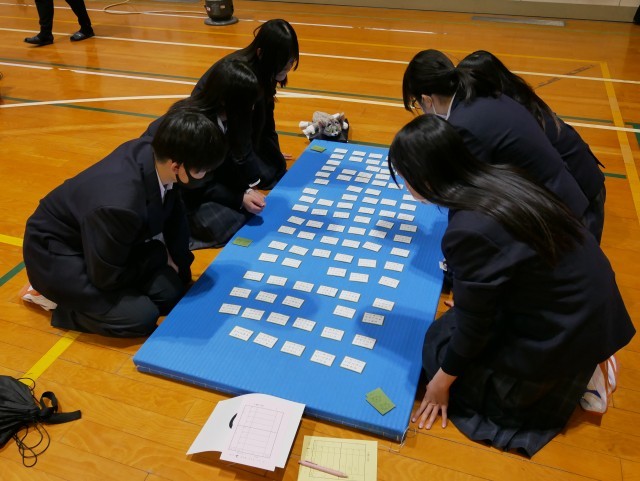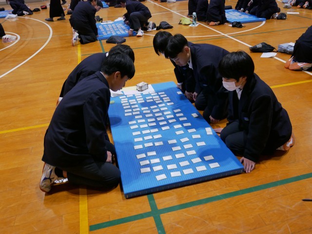 武道場から畳をもってきて敷き、札を並べ、太鼓の合図でいよいよ開始。1年生の百人一首大会です。この日に向けて国語の時間等で練習を重ねてきました。「あまのはら~」「はいっ」上の句で取れればたいしたものです。頭に入っている札は何枚あるでしょうか。