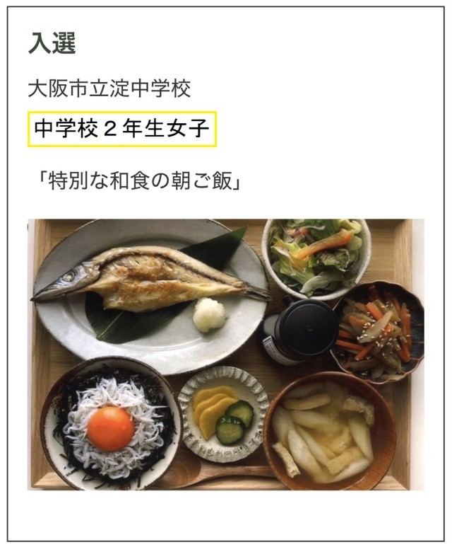 4,208作品の中からこの給食だよりで紹介されたのはなんと11作品!すごいです。審査の概要は、【彩や盛りつけ方がきれいである】そして【栄養バランスや味、調理方法のバランスが良く、写真撮影の工夫をしている】という観点で、給食関係者のみなさまの投票により選出されたとのことです。