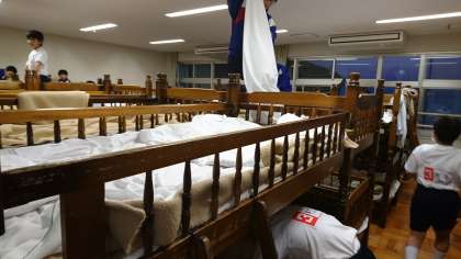 夕食後、早めに寝具の準備の時間です。この後、室内オリンピックの予定です。