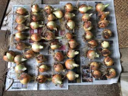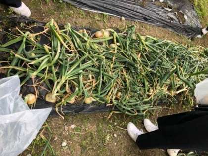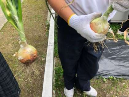 元気アップボランティアの方々のご協力のもと、畑で栽培していた玉葱を子ども達の手で収穫することができました。