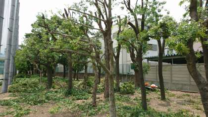6/3(月)より、通称「西淀の森」の伐採が始まりました。うっそうと繁り、近隣にも迷惑をかけていました。今週いっぱい作業が続きます。